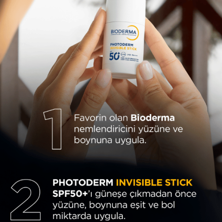 Stick güneş kremini yüze uygularken bazı ipuçları göz önünde bulundurulmalıdır. Ürünün cilt üzerinde yeterli düzeyde etkin bir koruyucu film oluşturabilmesi için, her bölgede ürünü ileri geri birkaç kez sürmek gerekir. Tek bir kat geçmek, ciltte yeterli miktarda ürün bırakmaz. Uygulama sonrasında ürünü parmak uçlarınızla hafif tampon hareketler yaparak iyice yedirebilir, daha homojen dağıtabilirsiniz. Bioderma Photoderm Invisible Stick SPF50+'in görünmez yapısı sayesinde güneş koruyucuyu kat kat sürseniz de cildinizde iz kalmayacağından emin olabilirsiniz.